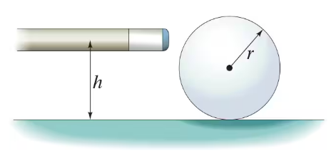 If a billiard ball is hit in just the right way by a cue stick, the ball will roll without slipping immediately after losing contact with the stick. Consider a billiard ball (radius r, mass M) at rest on a horizontal pool table. A cue stick exerts a constant horizontal force F on the ball for a time t at a point that is a height h above the table’s surface (see Fig. 10–78). Assume that the coefficient of static friction between the ball and table is μs. Determine the value for h so that the ball will roll without slipping immediately after losing contact with the stick.