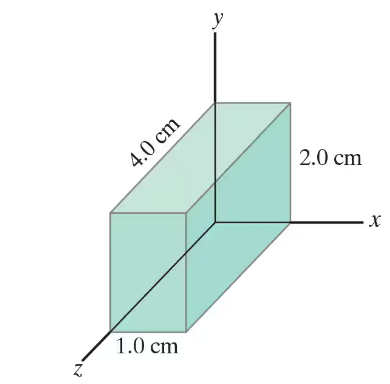 A rectangular solid made of carbon has sides of lengths 1.0 cm, 2.0 cm, and 4.0 cm, lying along the x, y, and z axes, respectively (Fig. 25–36). Determine the resistance for current that passes through the solid in the z direction. (Assume the resistivity is ρ = 3.0 x 10-5 Ω•m) .