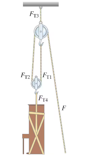 What minimum force F is needed to lift a piano (mass M) using the pulley apparatus shown in Fig. 4–64? Determine the tension in each section of rope: FT1, FT2, FT3 and FT4. Assume pulleys are massless and frictionless, and that ropes are massless.