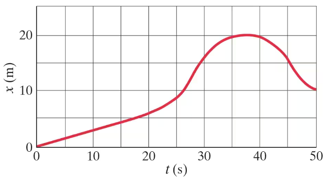 (II) The position of an object along a straight tunnel as a function of time is plotted in Fig. 2–40. What is its instantaneous velocity at t = 10.0 s?