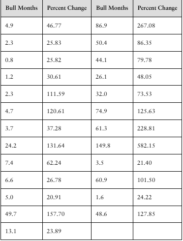 Bull Markets A bull market is defined as a market condition in which the price of a security rises for an extended period of time. A bull market in the stock market is often defined as a condition in which a market rises by 20% or more without a 20% decline. The data to the right represent the number of months and percentage change in the S&P 500 (a group of 500 stocks) during the 25 bull markets dating back to 1929 (the year of the famous market crash).