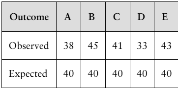 Step 1: Identify the hypotheses. The null hypothesis \(H_0\) states that all proportions are equal, i.e., \(p_A = p_B = p_C = p_D = p_E = \frac{1}{5}\). The alternative hypothesis \(H_1\) states that at least one proportion is different.